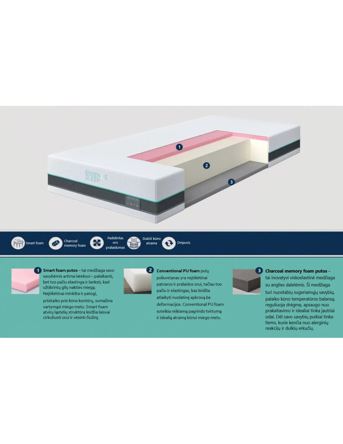 The polyurethane foam core of the mattress is covered with innovative Smart foam and Charcoal memory foam . Smart foam is a latex substitute, incredibly soft and comfortable. Charcoal memory foam - maintains your body temperature balance, performs a thermoregulatory function, and prevents sweating. With the ESSENCE SLEEP ASTRON mattress you will sleep longer and more comfortably.